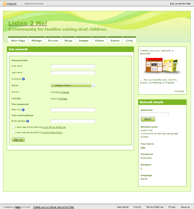 My social group is called Listen2Me. It is designed for parents raising deaf children, however anybody can join. Members can join in the discussion forums, or start new discussions about their deaf child(ren) and their concerns, questions, ideas or anecdotes. They can also post pictures or videos, write a blog, create and see upcoming events, and look through links that other parents of deaf children have found helpful, or add their own links to the list.